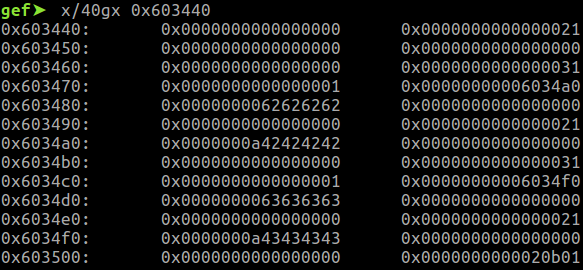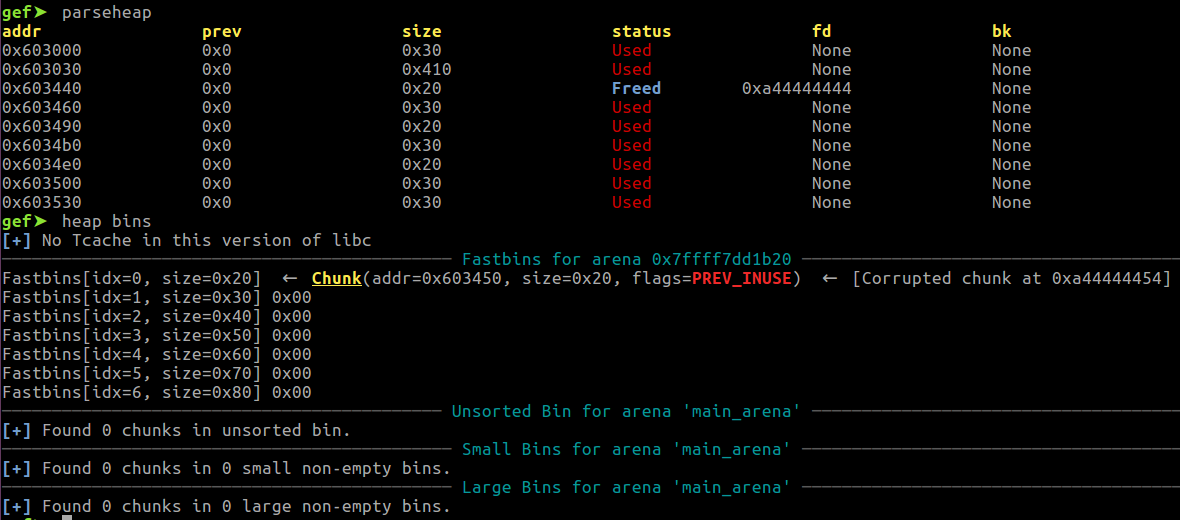 다음 한번더 동일한 크기로 힙을 할당하면 0x603450이 fastbin에 들어간다