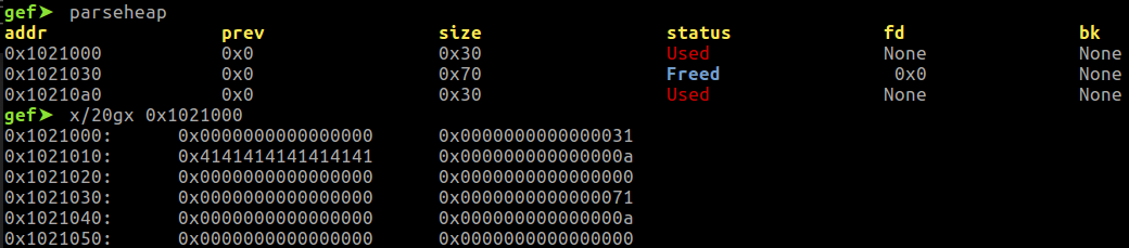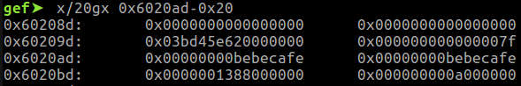 다음 smallbin사이즈의 힙을 한번 더 할당하면, 0x6020ad에 원하는 값이 덮어씌워지게 된다. 확인해보자.