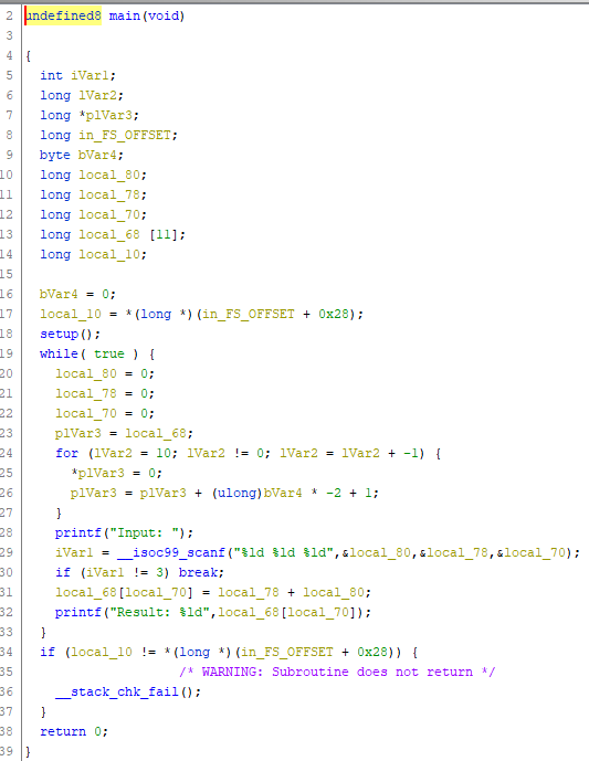 local_68은 인덱스가 11이지만 OOB취약점 때문에 ret까지 덮을 수 있다.